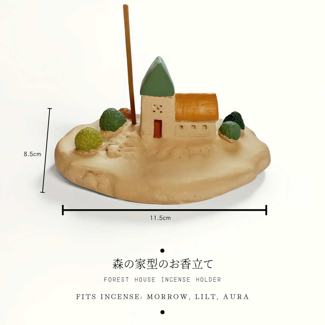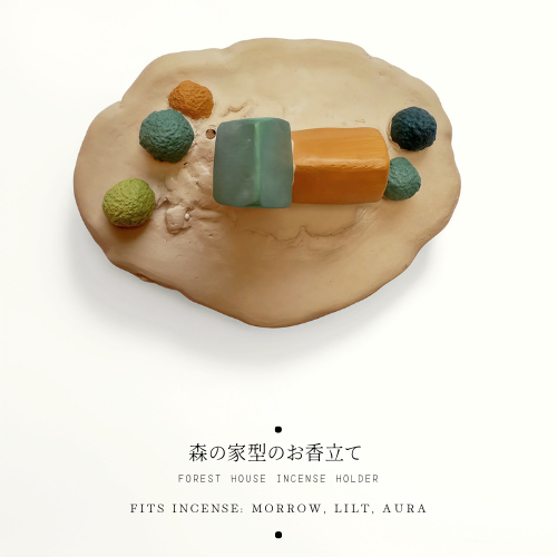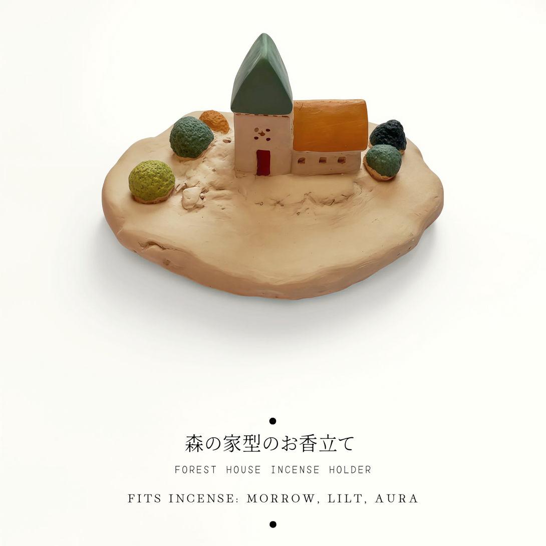 A serene, hand made smooth clay incense holder: a tiny forest house perched on a mountain. The motif blends the mountain’s strength and aspiration with the forest’s renewal and sanctuary, creating a quiet altar for intention and calm. Incense smoke rises like mist over a hillside—purifying, centering, and softly atmospheric.