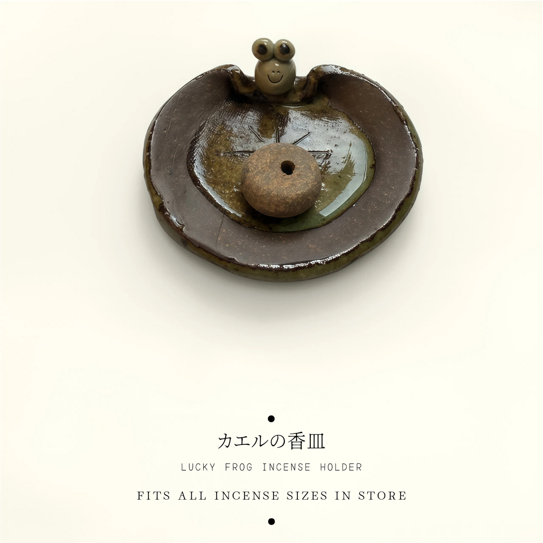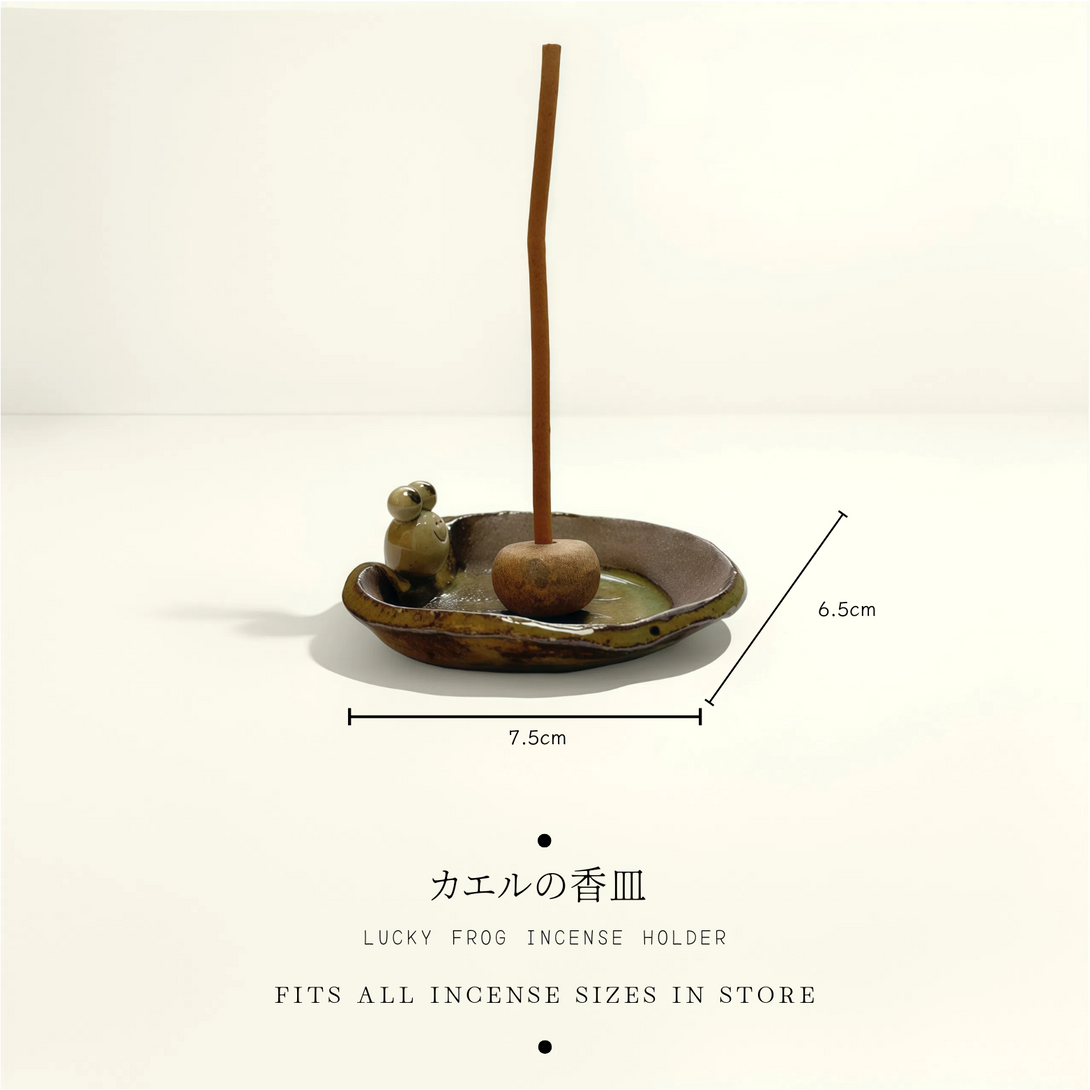 Crafted in Japan from textured crude pottery, this incense holder blends rustic charm with refined minimalism. The frog, a symbol of luck and safe returns, adds meaning to your space. Each piece features natural sand-like texture with delicate glazed accents — one of a kind, both in form and spirit.