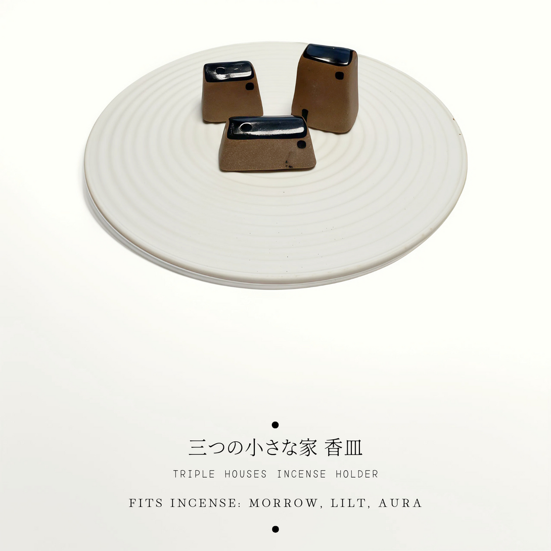 A calm, architectural vignette: three sculptural houses gathered on a matching plate. The silhouette is simple and refined—quiet lines, soft volumes, and an airy negative space—turning your incense ritual into a small, curated scene.